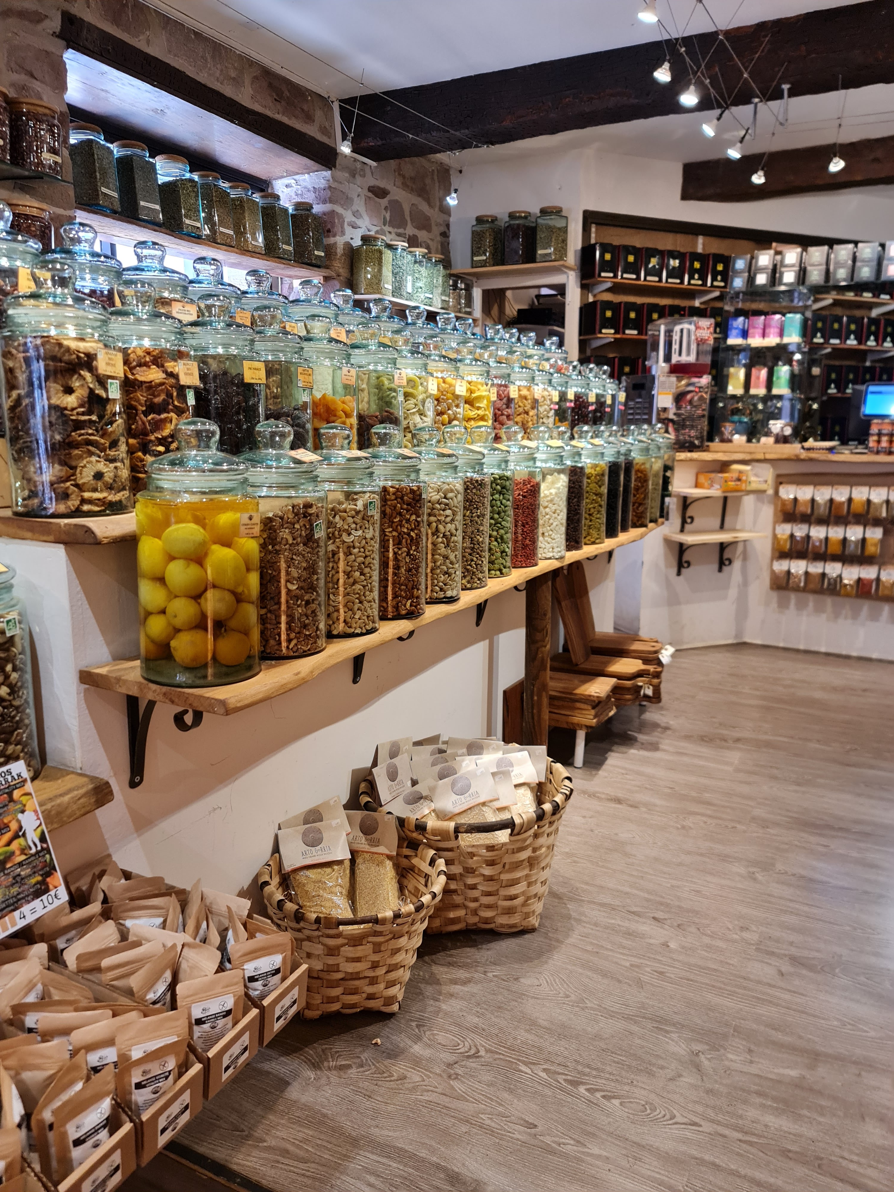 Trés beau magasin avec un très grand choix d'épices du monde (plus de 100 je pense ) de mélange pour la cuisine, de fruits séchés et de thé Le magasin qui se situe juste en face de l'église offre en soit un voyage olfactif nous le recommandons à nos amis de passage et faisons nos mélanges pour le barbecue